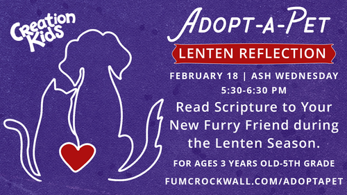 We are excited to launch our Adopt-a-Pet Lenten Reflection. Beginning Wednesday, February 18 your children will have the opportunity to adopt a stuffed puppy or kitty to love and care for during the season of Lent. Each child will be provided with 40 days worth of short scripture passages to read to their furry friend, together learning all about the days leading up to Jesus' death and resurrection.