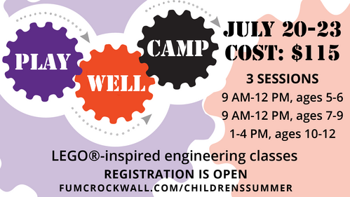 Need all day care for your child? Join us for FUN Camp with FUMC Rockwall Children's Ministry staff! What is FUN Camp? We spend the day having, well, FUN! Playing, building, crafting, and cooking. Each day we will have an interactive Bible story, enjoy a snack that we cook, and go to the playground and/or Blue Block play area. Wednesday is movie and popcorn day -- it's a favorite! If you have questions, email Allison, Director of Children's Ministry.
