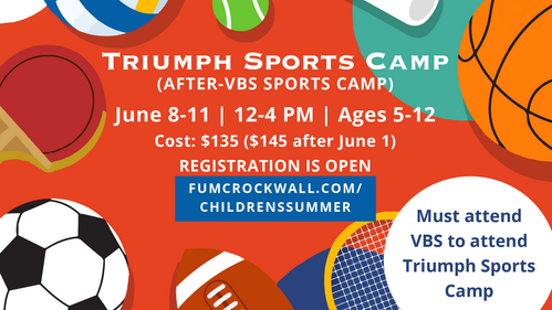 Must attend VBS to attend Triumph Sports Camp. Kids will need to bring a sack lunch and labeled water bottle.